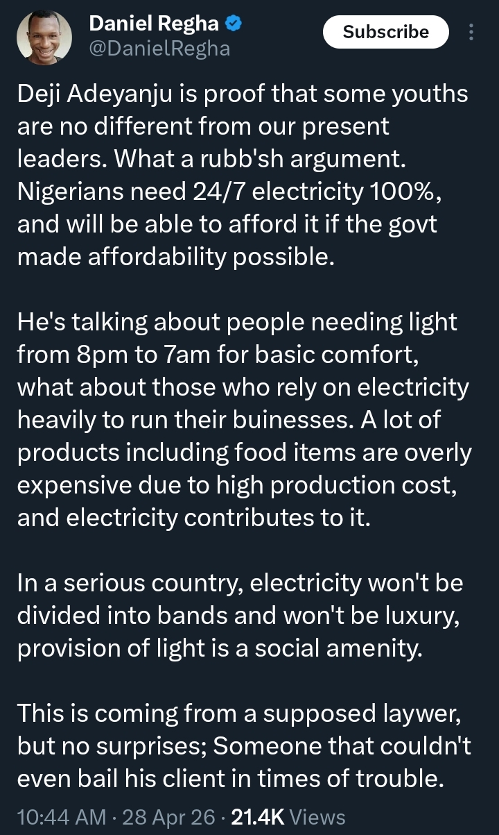 In a heated exchange on social media, Nigerian commentator Daniel Regha has criticised activist and lawyer Deji Adeyanju over his recent comments on electricity supply in the country.