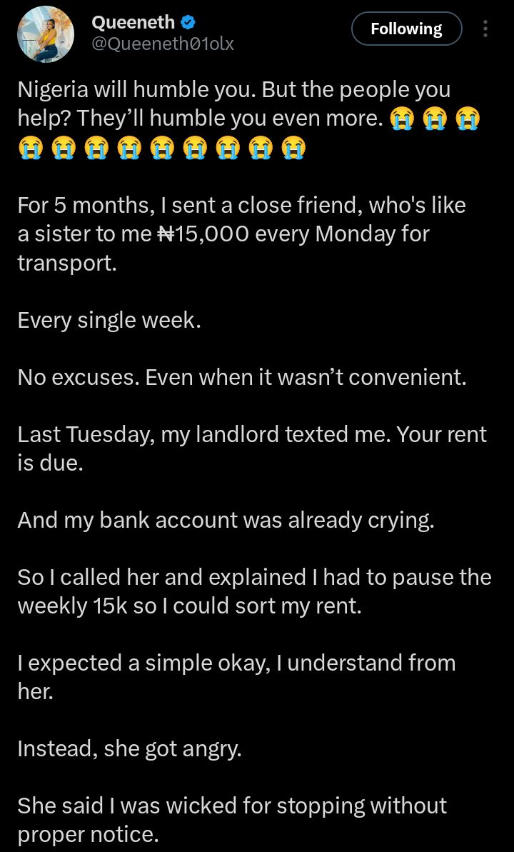 “For five months, I sent a close friend, like a sister to me, ₦15,000 every Monday. No excuses, even when it wasn’t convenient. But last week, my landlord reminded me that my rent was due, and my account was already drained,” she said.