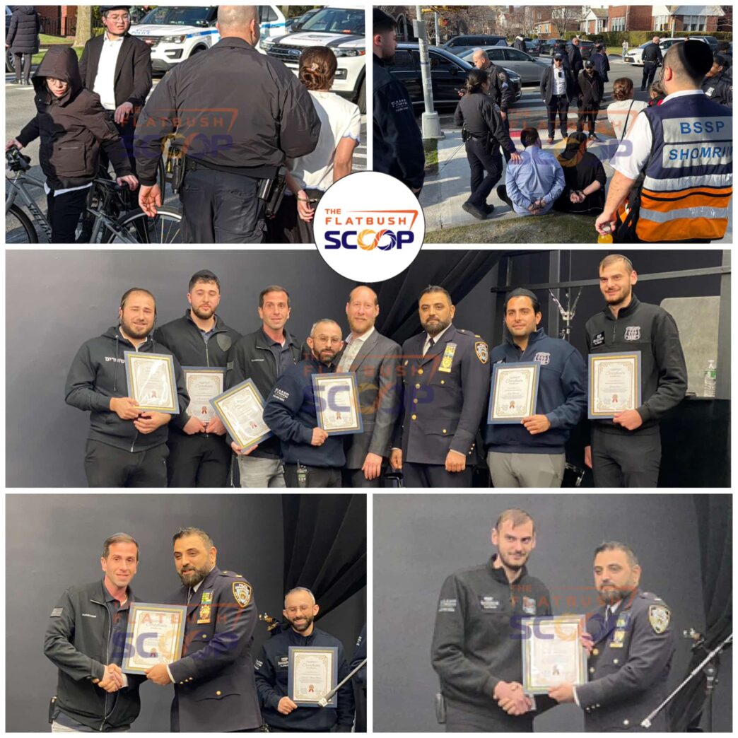 PHOTOS & VIDEO: NYPD 108th Precinct Commanding Officer, Deputy Inspector Hameed Armani, honored members of Flatbush Shomrim tonight for their role in assisting with the arrest of suspects involved in a “gypsy scam” operation wanted out of the 108th Precinct in Queens and tied to a broader citywide pattern, as previously reported by Flatbush Scoop. The suspects were taken into custody on Wednesday, March 25, at Avenue S and East 5th Street. Three individuals were arrested and were responsible for more than 10 similar scams across New York City.
