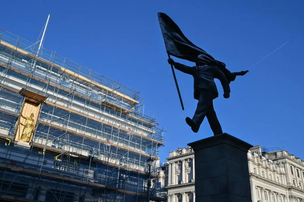 The statue – of a suited man marching, with one leg off the plinth, while carrying a flag that is covering his face – reportedly first emerged on April 29 just off the central street of Pall Mall.